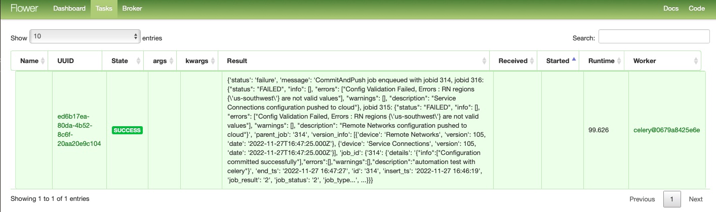 Eventually the response would come back. Since the response is wrapped around the Task response it shows as success, but looking at the results within the task response you can see it failed. This is an issue with Prisma API and a bug with the way the Remote Network works, but is being worked on. Either way this proves out the process of being able to send your API tasks to a backend to not tie up your services and be able to handle mulple jobs and control them in an easy to deploy fashion.
