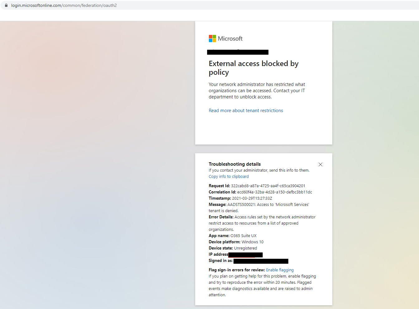 The additional login.live.com URL with a required “restrict-msa” in order to prevent online usage of applications outside of a users tenanat. Leveraging the above inside the HTTP Header Insertion policy created above seems to achieve this. By adding the additional URL and setting that value to restrict-msa appears to resolve this issue where Users are able to login through the Web and use Microsoft Web Apps. What that will do is not allow a user to access login.live.com forcing users to access Microsoft Online Services through one of the 3 URL above. Without this additional header insertion users will still be able to leverage O365 servies online.